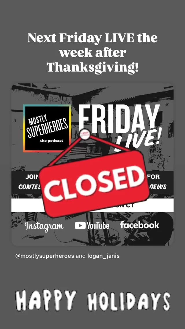 Join Mostly Superheroes Live every Friday on YouTube, Facebook, and Instagram for contests, Events, TV & FIlm Reviews, and Surprise interviews. Bookmark this page to check out preview Friday Live sessions.